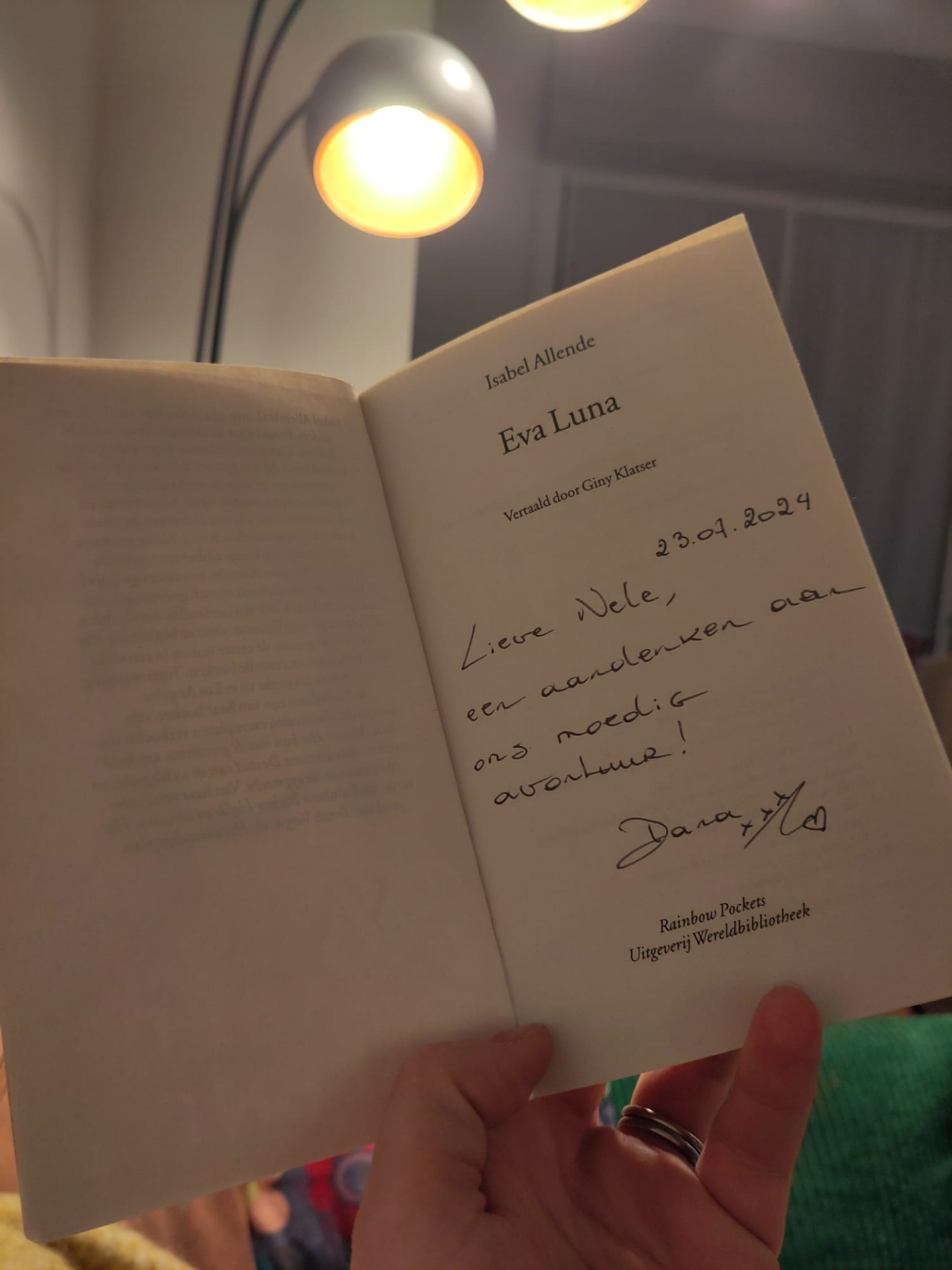 Dana en ik hebben samen de VEBASO-opleiding en de FLEX-Nederlands opleiding gevolgd. We hebben tijdens de opleiding veel gedeeld, van stress en twijfel tot enthousiasme en verbondenheid. Ze was mijn klankbord op moeilijke momenten. Eva Luna is voor mij dus niet zomaar een boek, maar vooral een herinnering aan fijne gesprekken, gedeelde momenten en de bijzondere band met Dana.