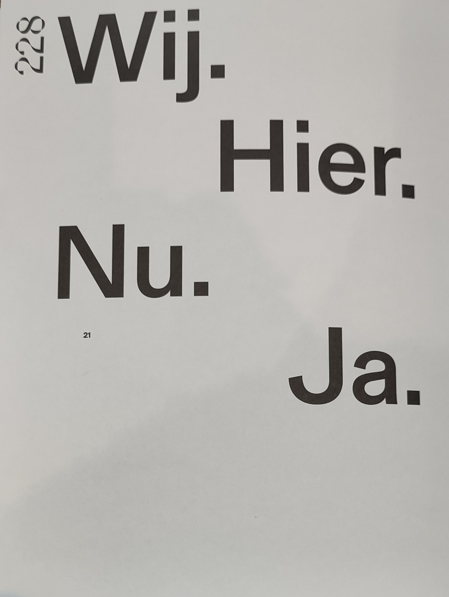 In dit gedicht komt het lyrisch ik naar voren als een stem die de essentie van het moment vastlegt en de kracht van het nu benadrukt. Het lijkt zich bewust te zijn van de vergankelijkheid van tijd en probeert een gevoel van aanwezigheid en verbondenheid op te roepen. De woorden "Wij. Hier. Nu." roepen een gevoel van urgentie en intensiteit op en toch voel ik ook veel mildheid.
