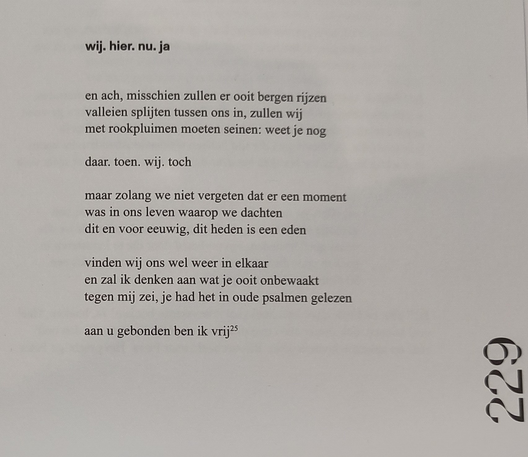 Vrijheid, geen begrip dat je zo vrij kan interpreteren. Er is de bandeloze vrijheid, maar ook een vrijheid die pas ontstaat bij verbondenheid. Die laatste is de insteek van het stadsgedicht dat sinds januari 2019 op de trouwboekjes in Antwerpen prijkt. (Maud Vanhauwaert, 2023c)