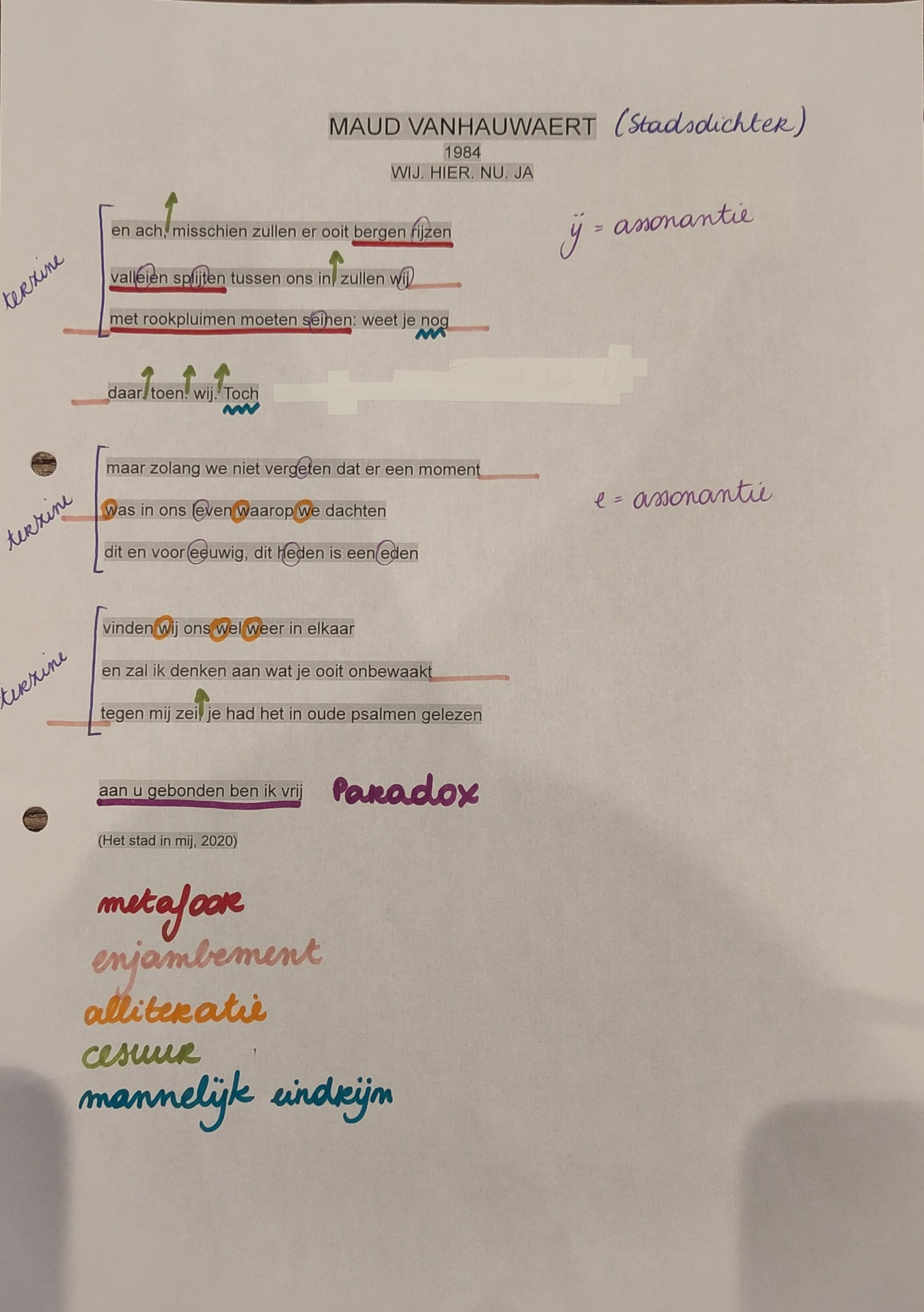 We zien ook nog de herhaling van woorden zoals "wij". Die versterken het ritmische gevoel en zorgen voor een gevoel van cohesie en continuïteit binnen de vrije versvorm.