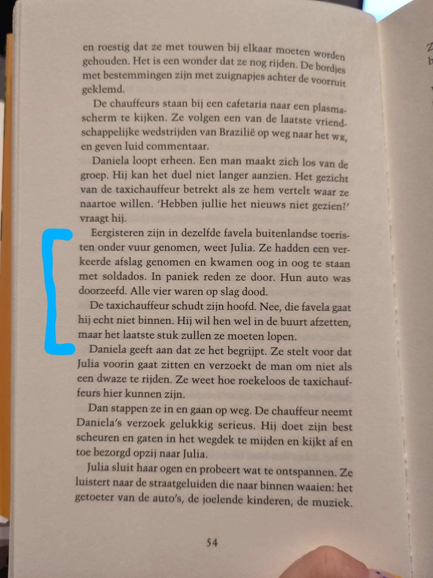 Het korte tekstfragment toont voor mij aan hoe realistisch het boek geschreven is, omdat ik zelf een gelijkaardige situatie heb meegemaakt met een taxichauffeur. Hij wilde ons (drie Europese toeristen) niet naar de plek brengen waar we moesten zijn omdat dat blijkbaar een te gevaarlijk deel van de favela was.